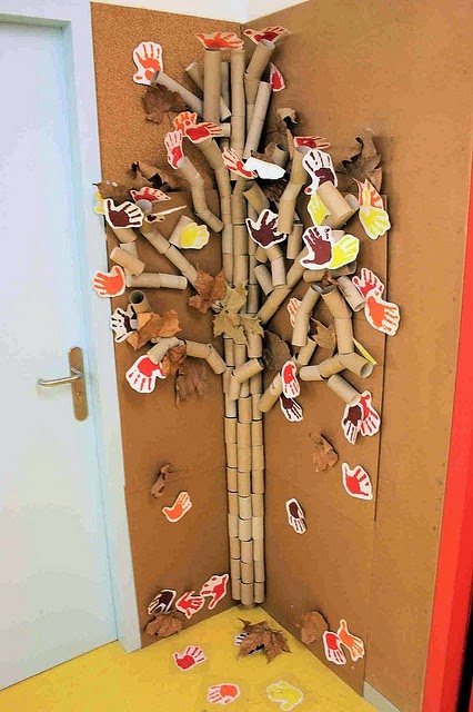 * Para começar e entender melhor essas folhas que caem das árvores no outono vamos reproduzir uma árvore com rolinho de papel, as folhas serão feitas com o carimbo das mãos, sempre nas cores marrom, amarelo e laranja: